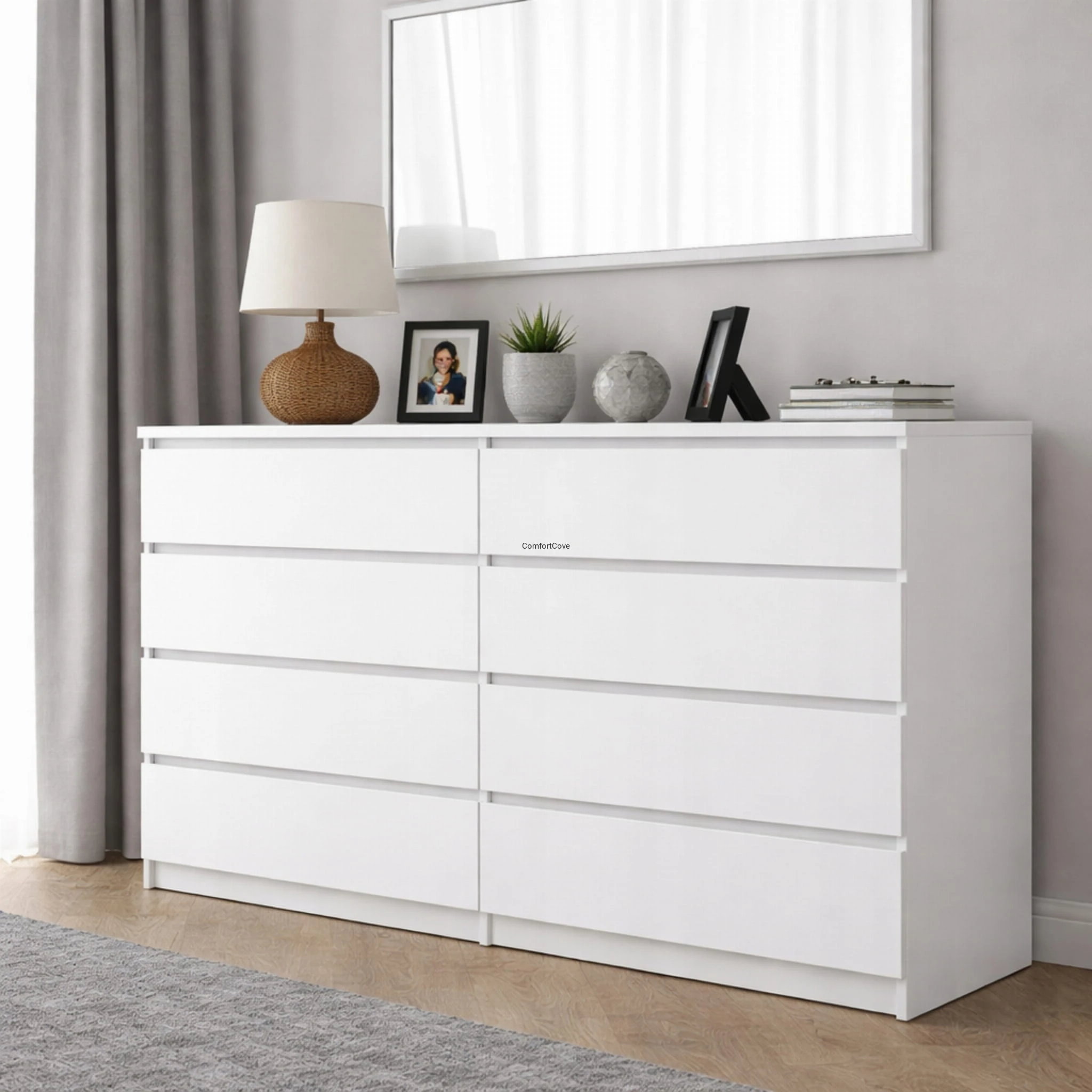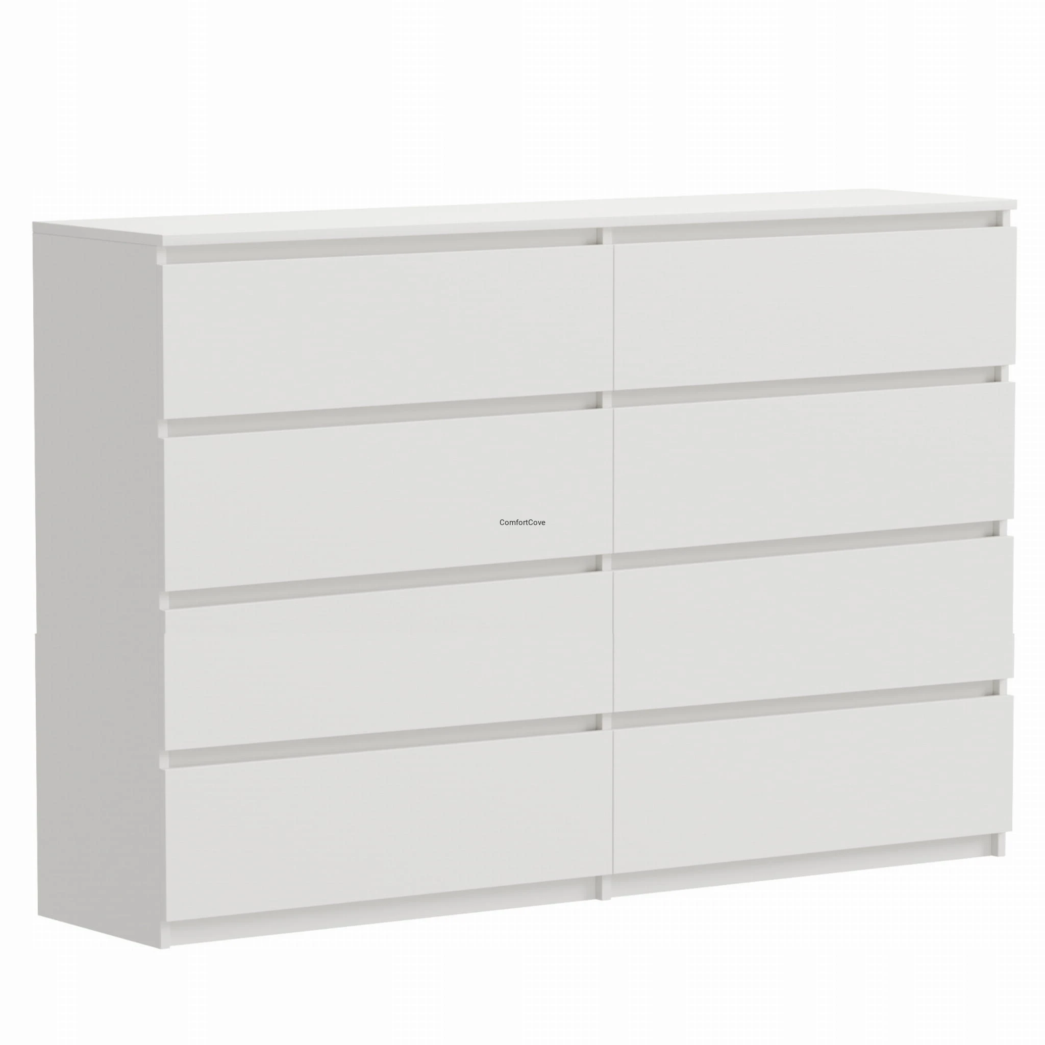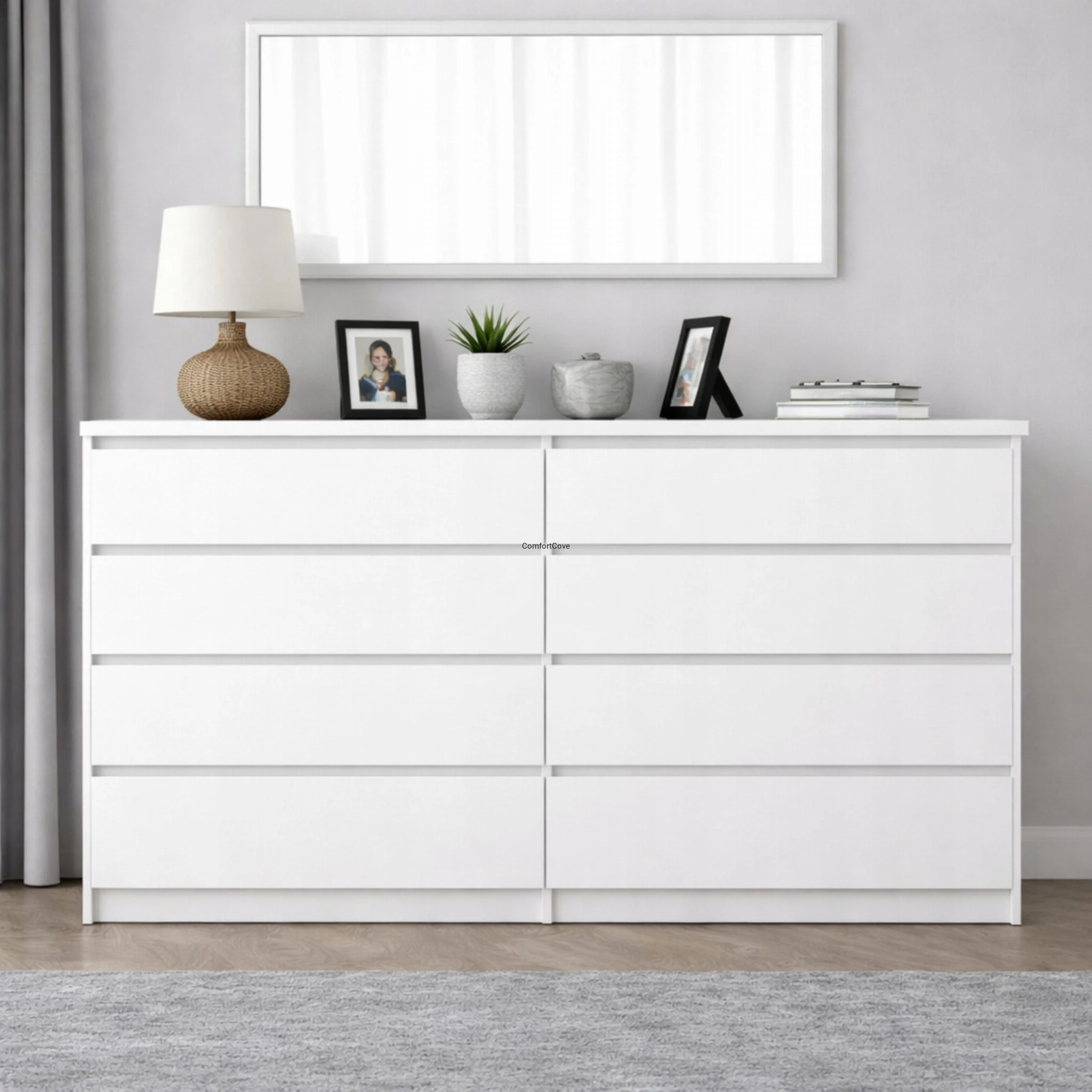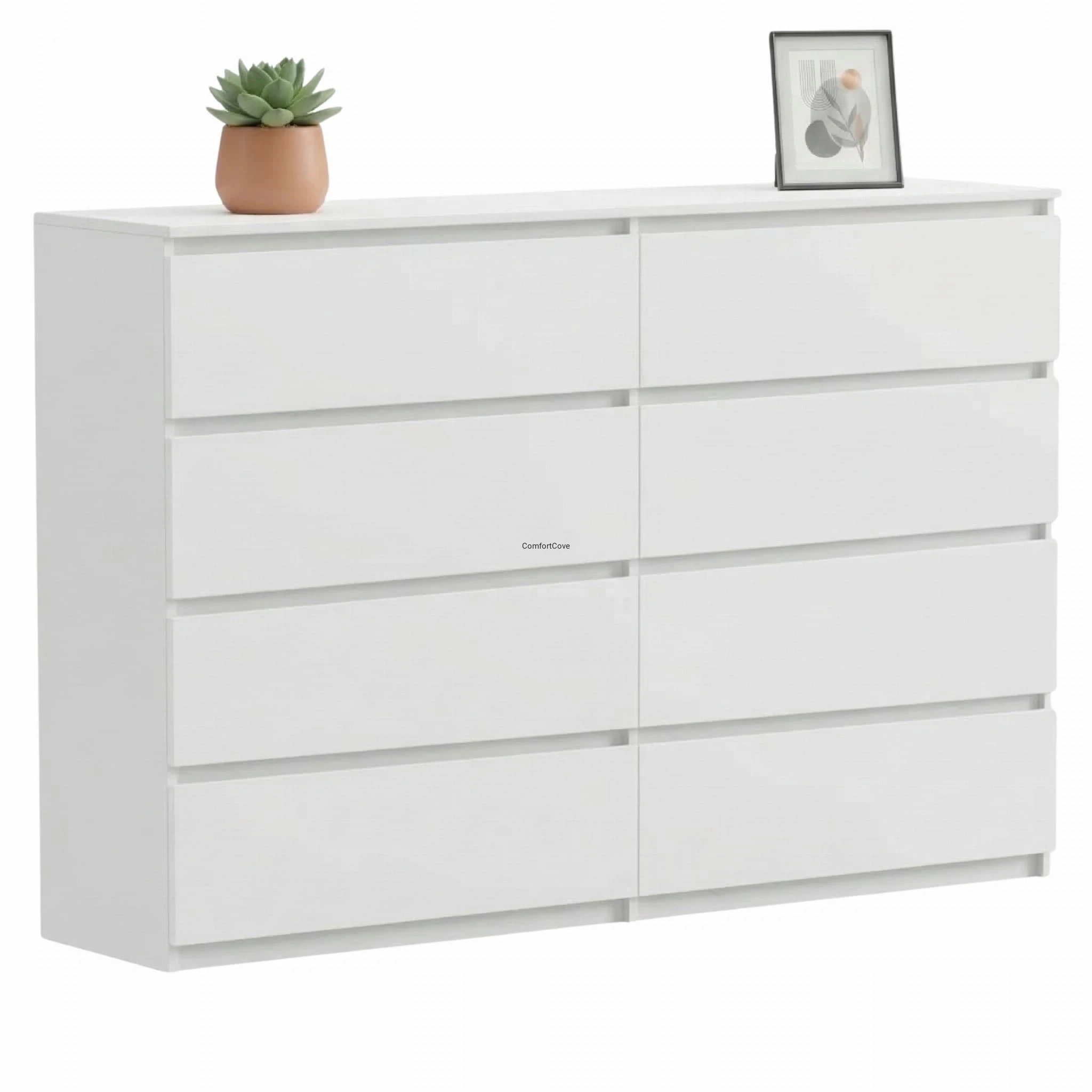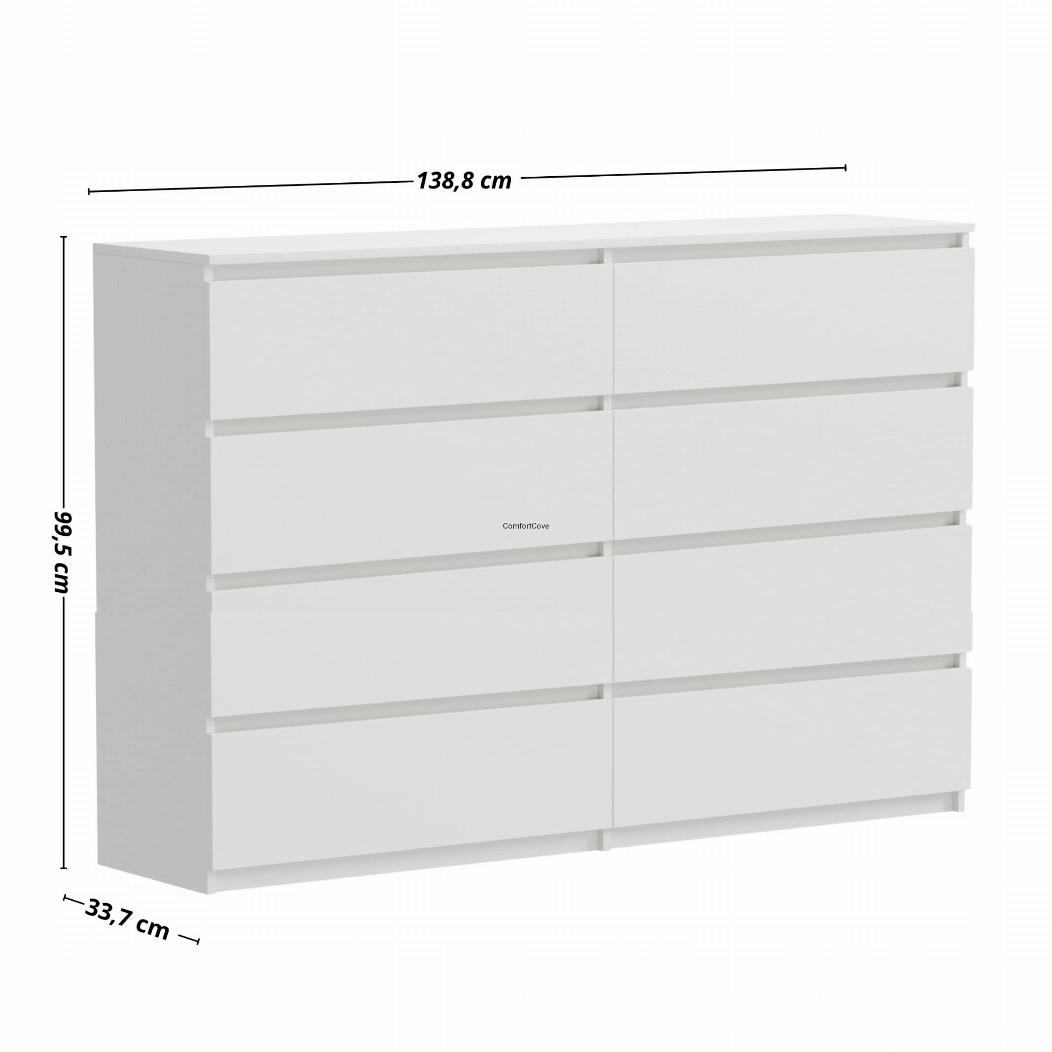 Nowoczesna komoda w kolorze białym z 8 pojemnymi szufladami to idealne rozwiązanie do salonu, sypialni, biura lub pokoju młodzieżowego. Dzięki dużej szerokości zapewnia jeszcze więcej miejsca do przechowywania, a minimalistyczny design doskonale pasuje do każdego wnętrza.