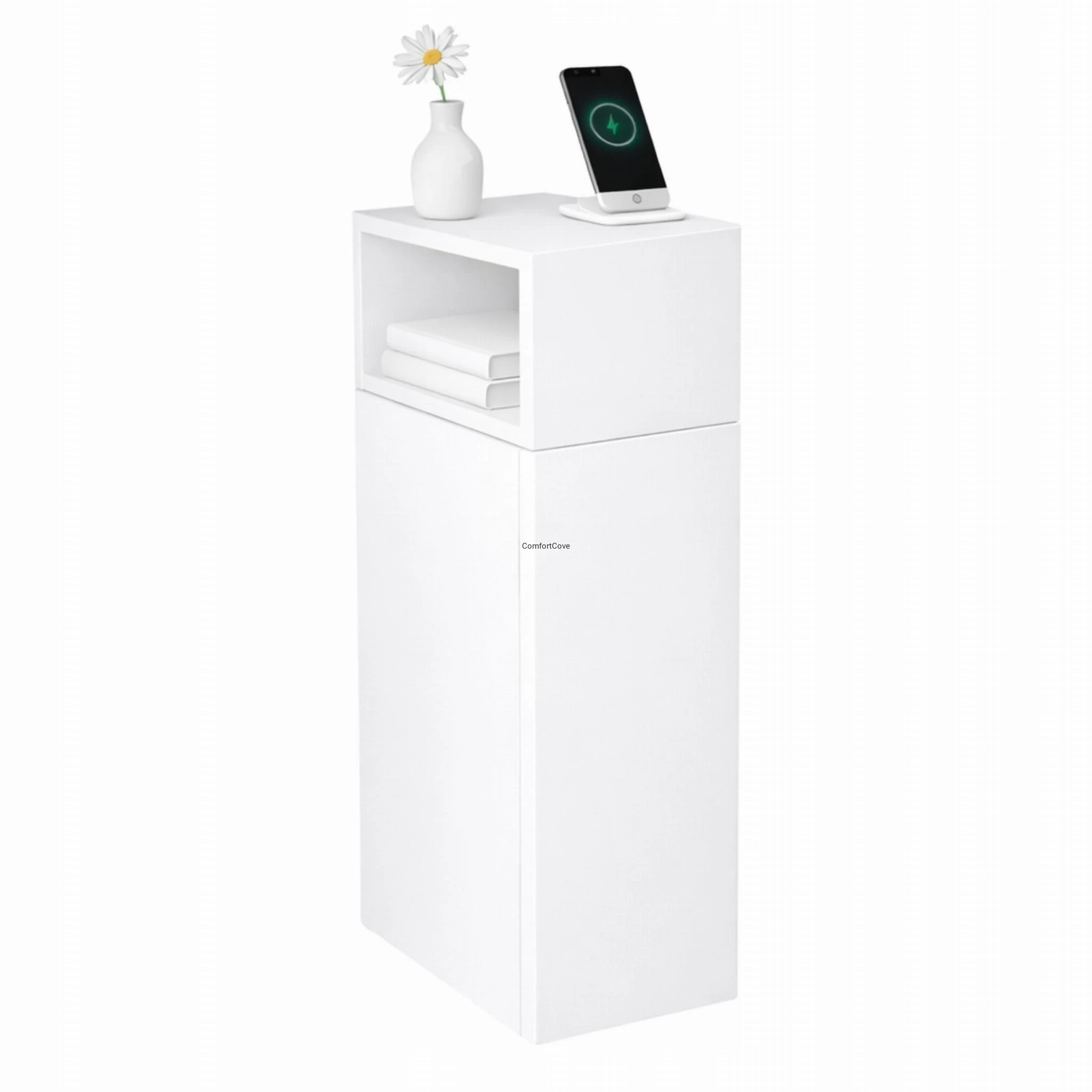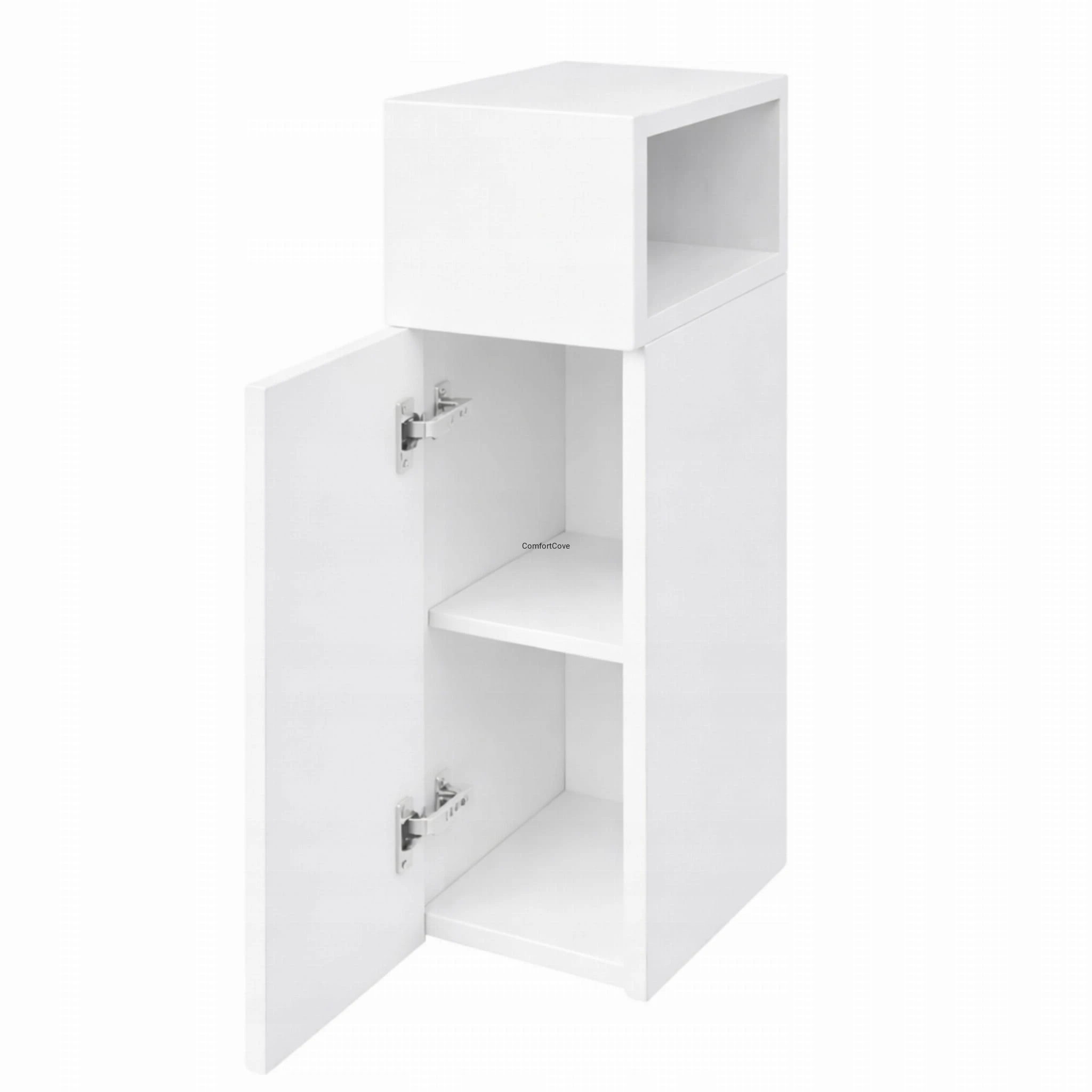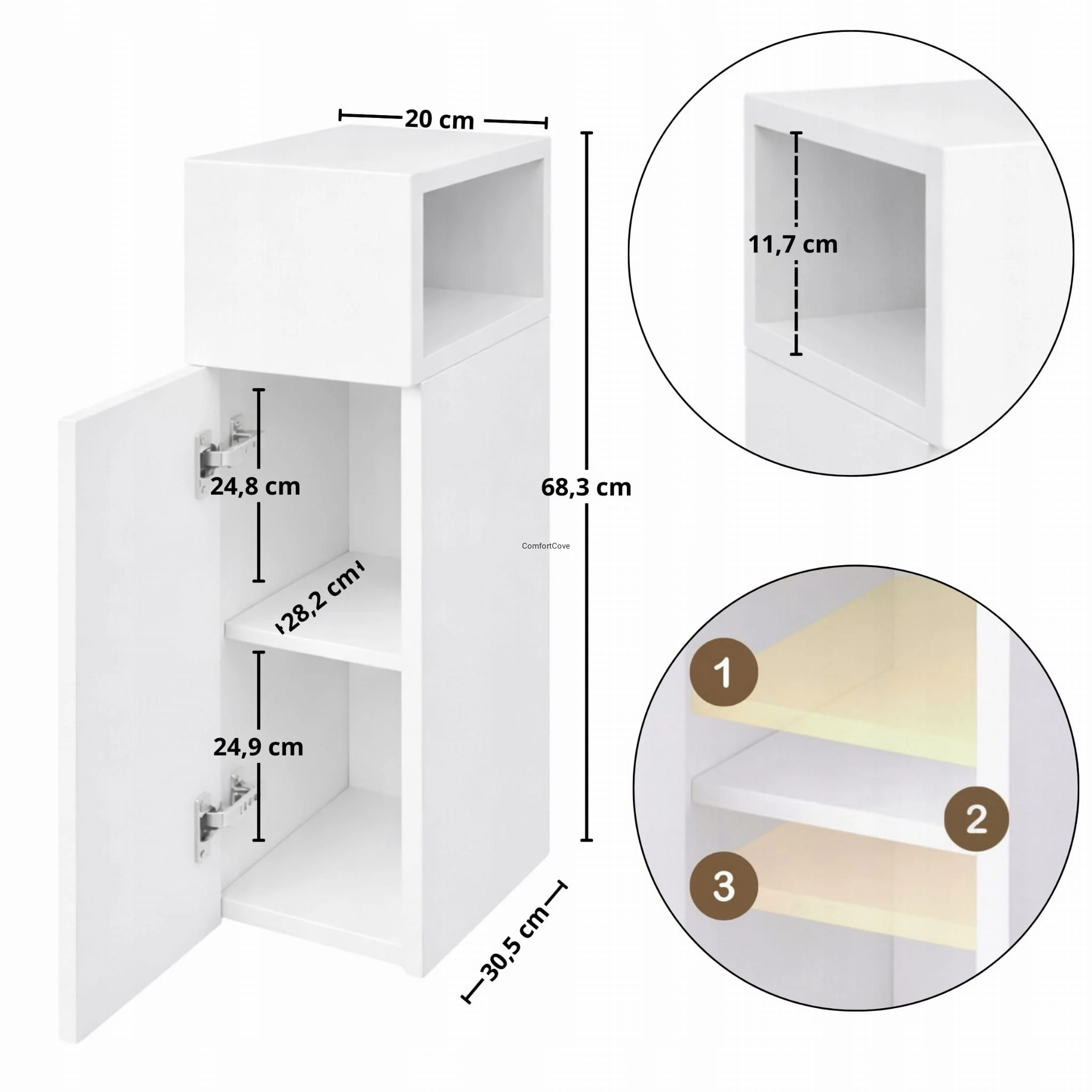 Wąska szafka nocna z boczną półką i systemem push to open to funkcjonalny mebel idealny do małych sypialni. Kompaktowe wymiary 20 × 30,5 × 68,3 cm pozwalają ustawić ją nawet w niewielkiej przestrzeni przy łóżku. Szafka posiada zamykaną część z regulowaną półką oraz praktyczną boczną półkę na książki lub drobiazgi. Nowoczesny system push to open umożliwia wygodne otwieranie bez uchwytów, a minimalistyczny design sprawia, że mebel pasuje do wielu aranżacji wnętrz.