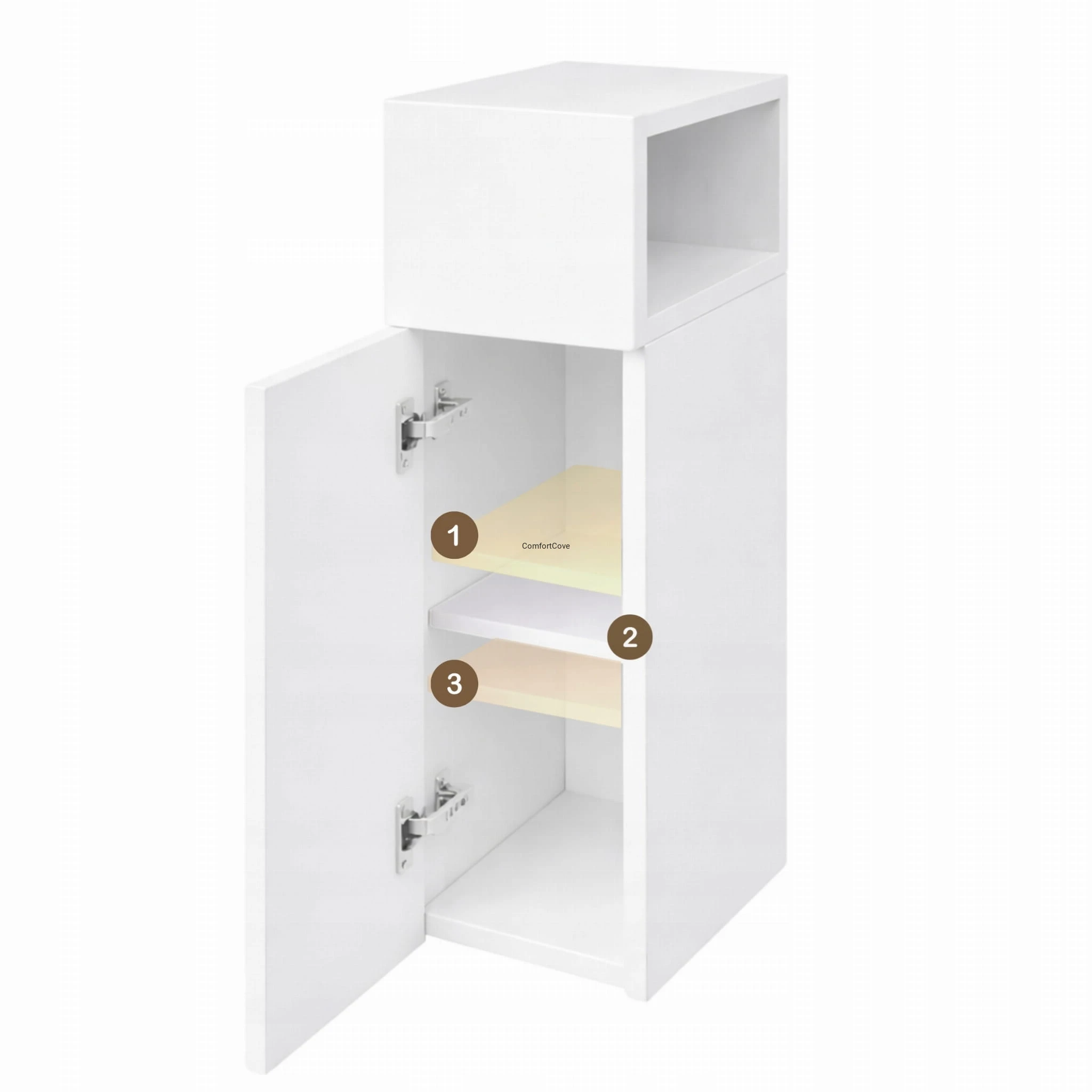 Szafka posiada praktyczną boczną półkę oraz zamykaną część z drzwiczkami otwieranymi w systemie push to open. Wewnątrz znajduje się półka z 3 stopniową regulacją wysokości, dzięki czemu z łatwością dopasujesz przestrzeń do przechowywania różnych przedmiotów.