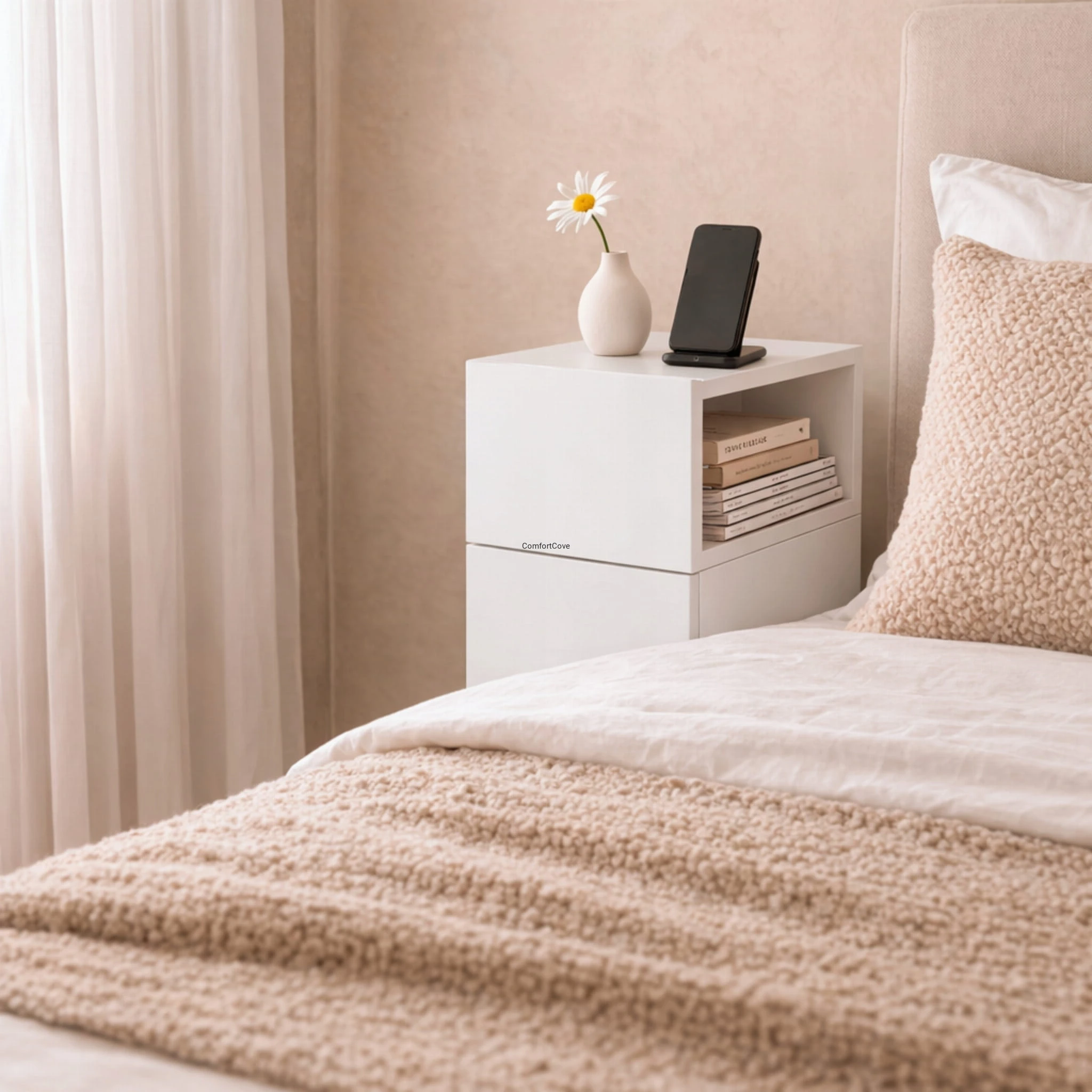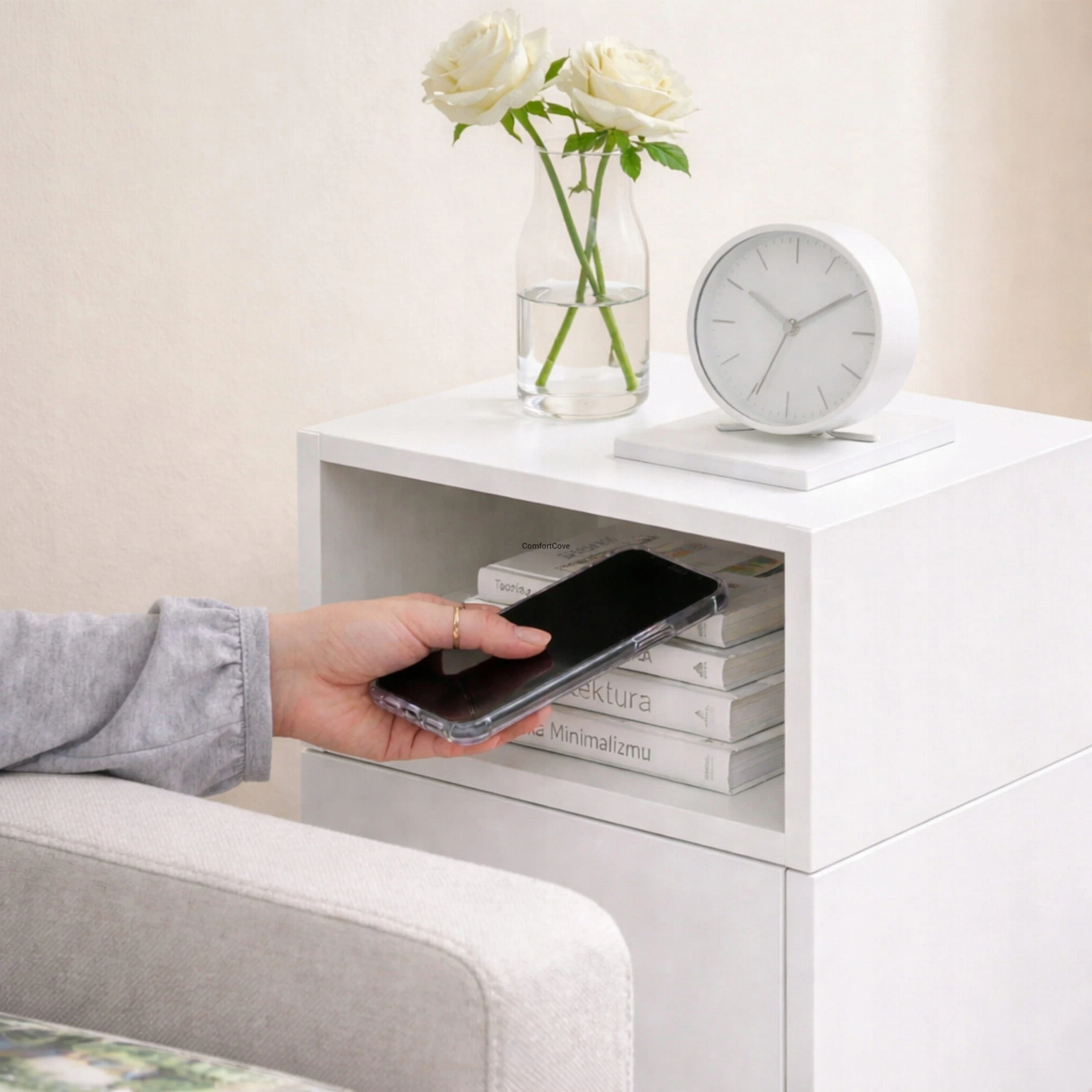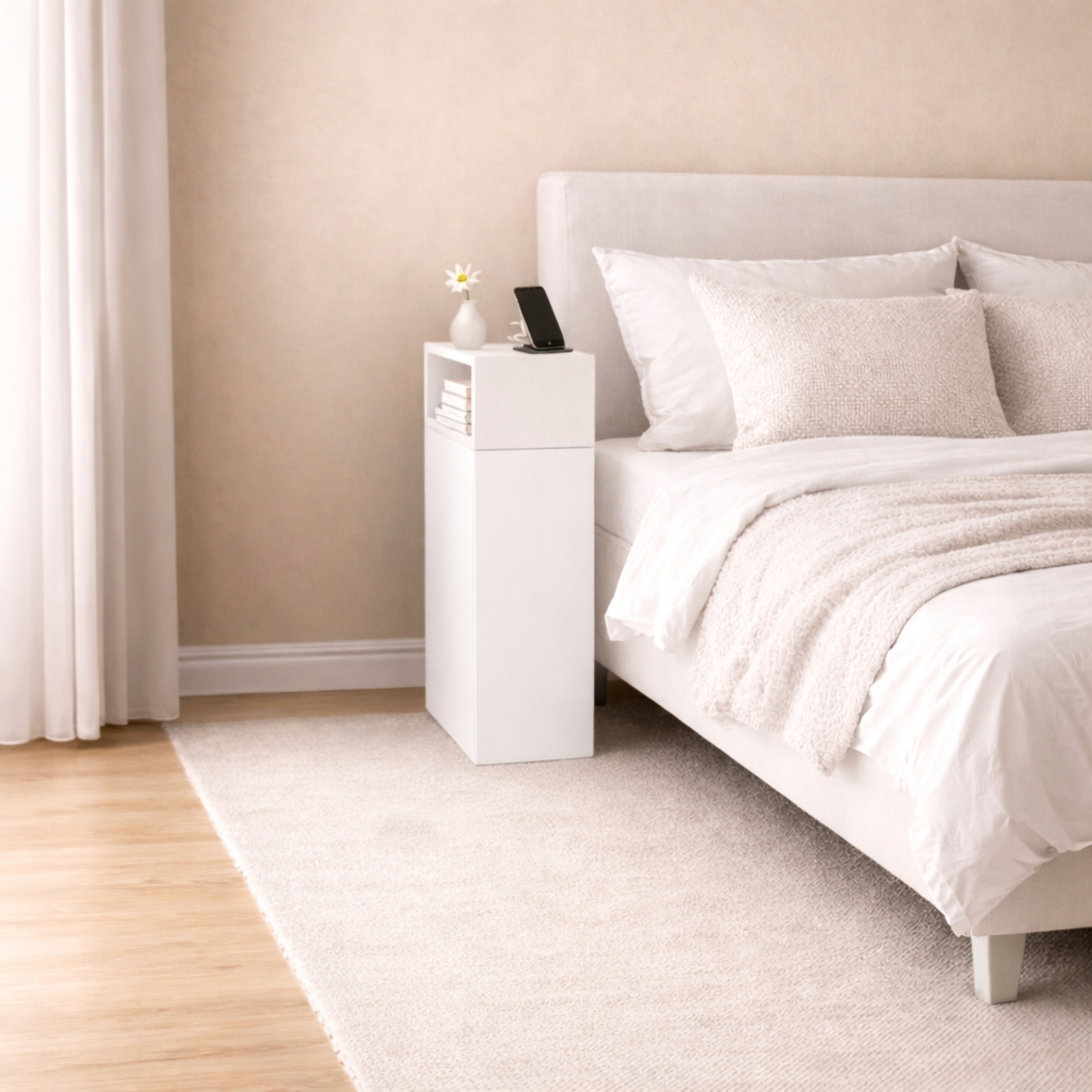✔ Zamykana część z drzwiczkami oraz boczna półka pomagają utrzymać porządek w sypialni.