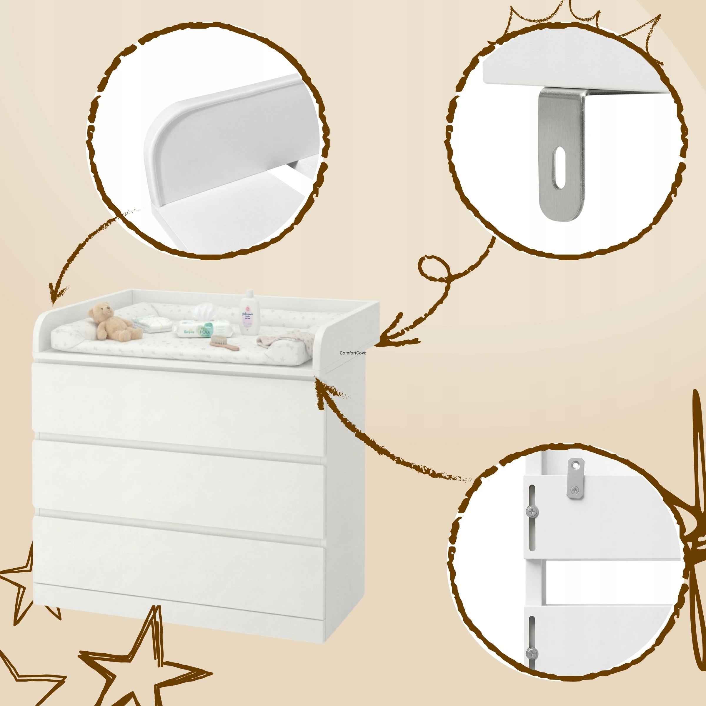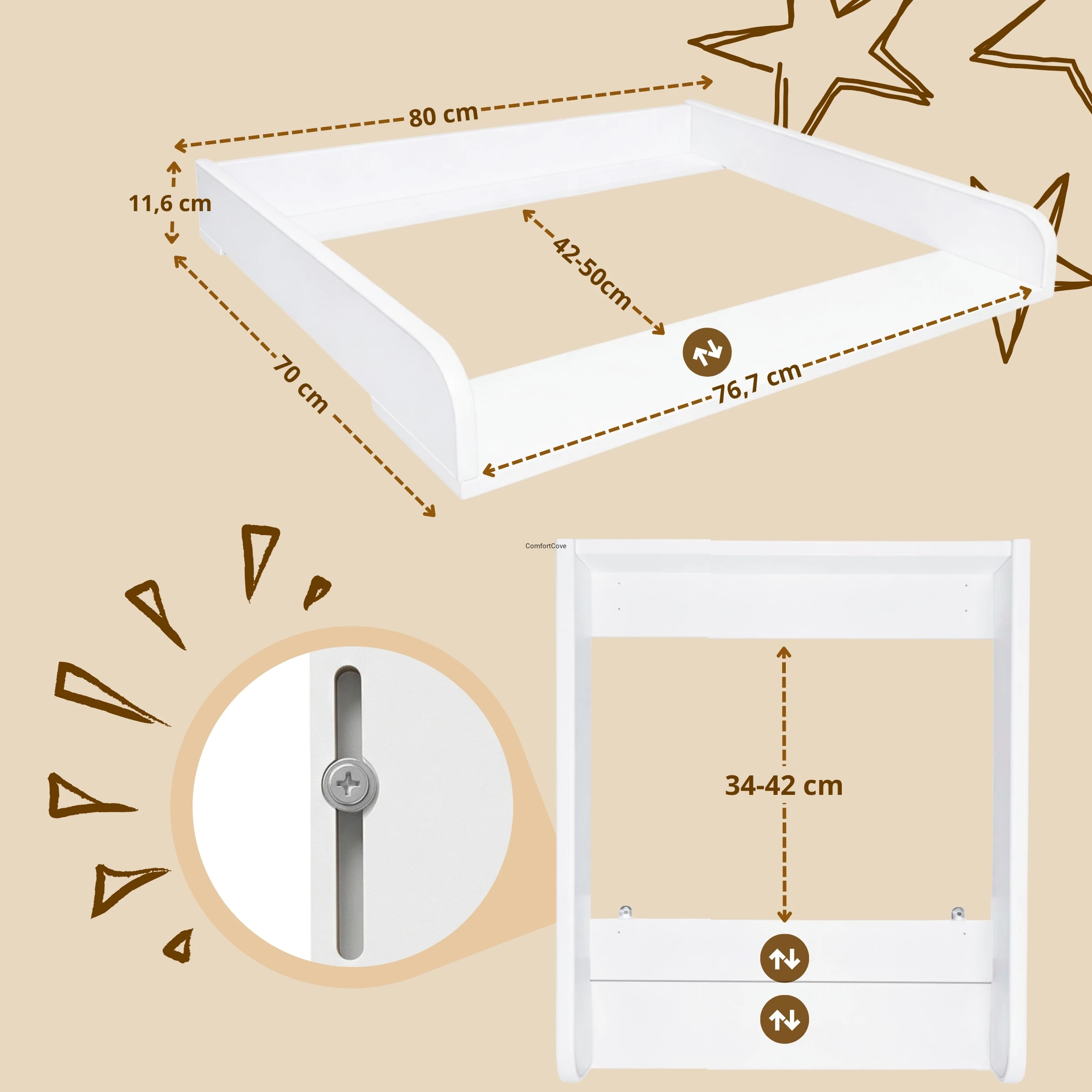 Nakładka została zaprojektowana z myślą o codziennym komforcie i bezpieczeństwie. Stabilna konstrukcja oraz możliwość trwałego montażu gwarantują wygodne użytkowanie podczas przewijania dziecka.