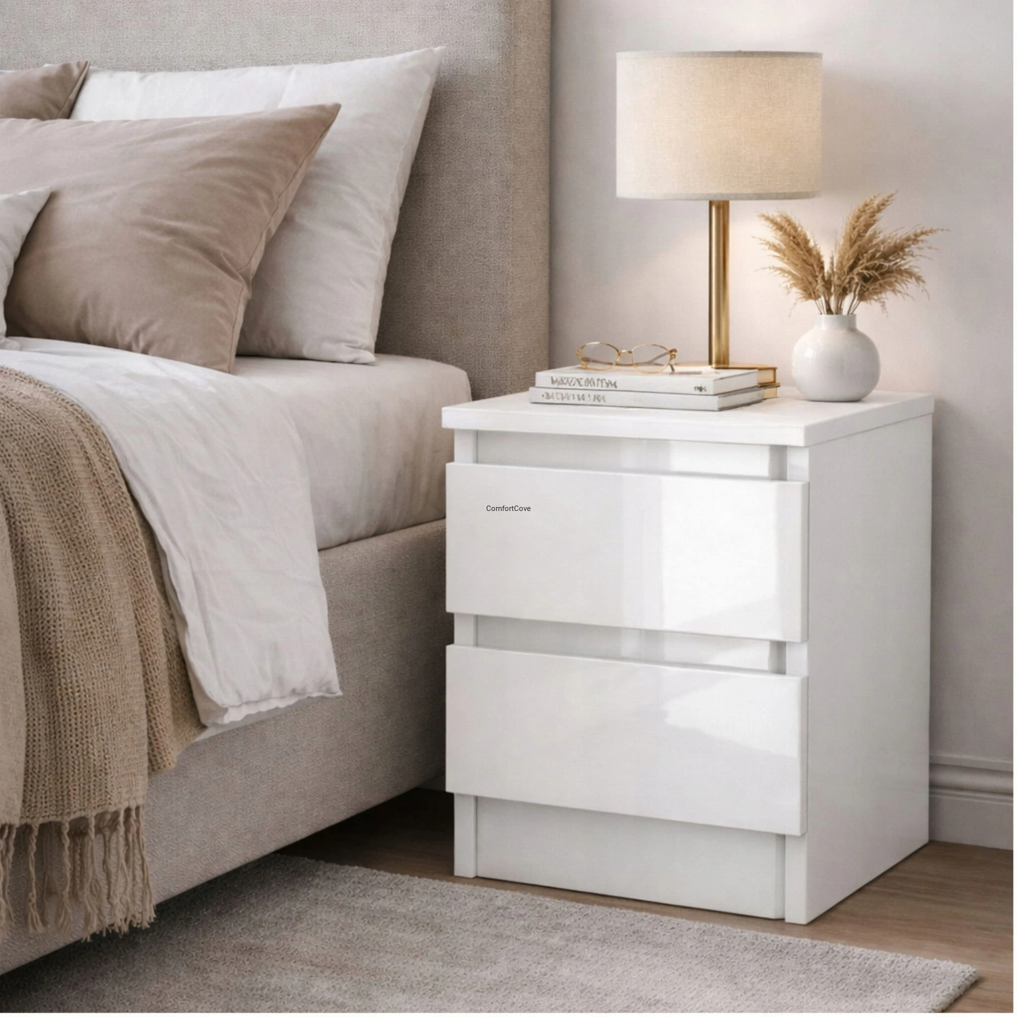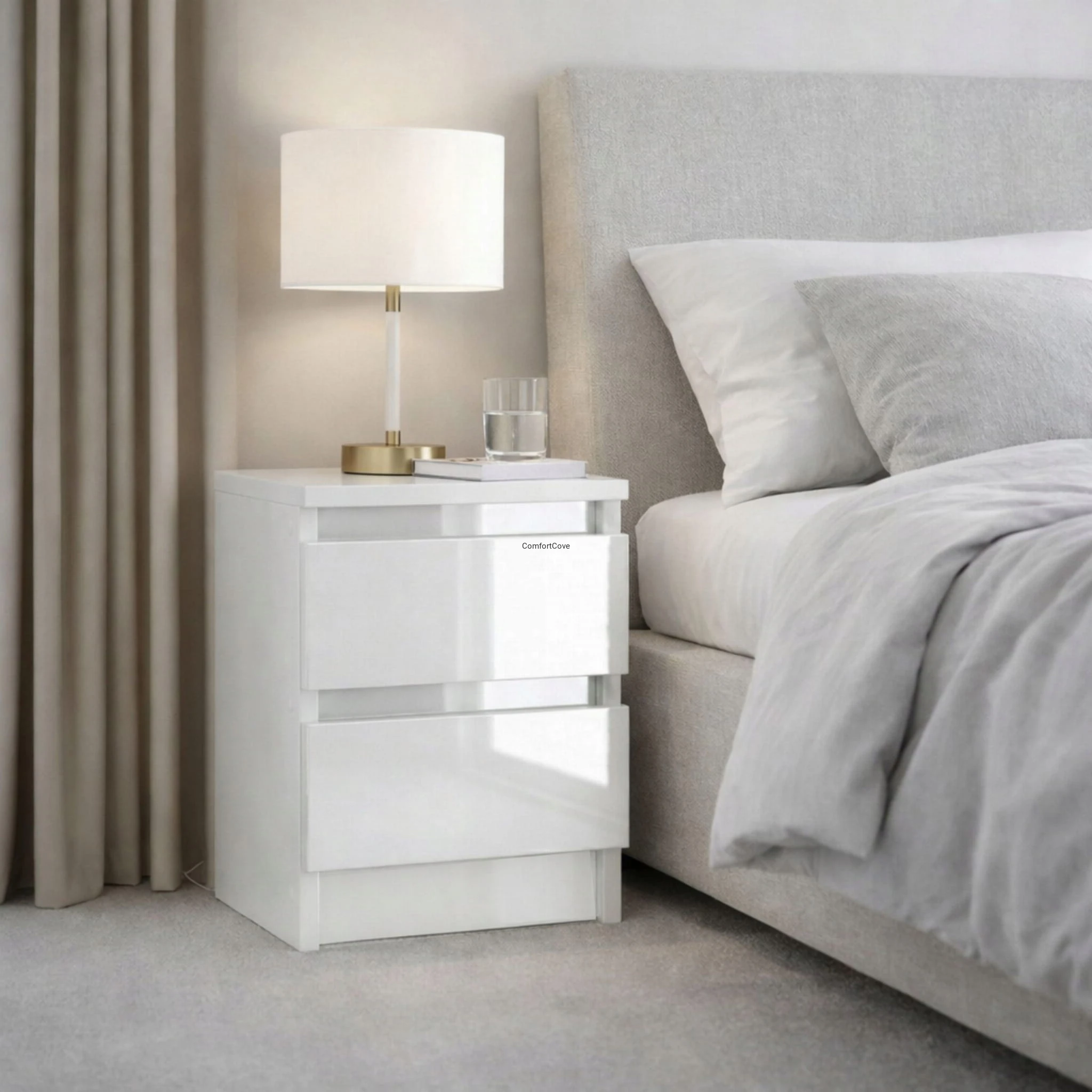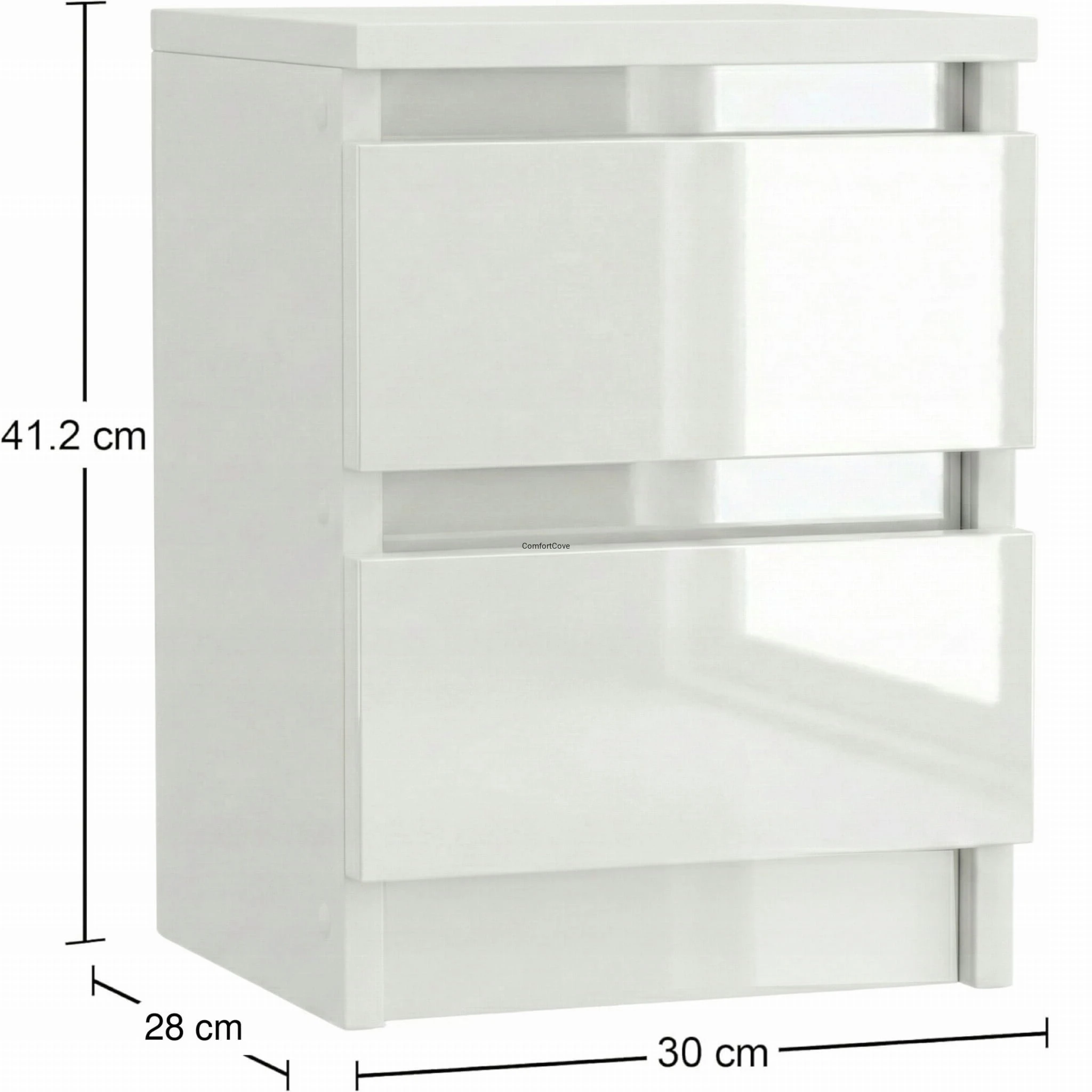 Szafka nocna biała w połysku z dwiema szufladami to nowoczesny i praktyczny stolik do sypialni, który świetnie sprawdzi się nawet w niewielkiej przestrzeni. Kompaktowe wymiary 30 × 28 × 41,2 cm pozwalają ustawić ją przy łóżku, w pokoju młodzieżowym lub obok biurka. Dwie pojemne szuflady z prowadnicami kulkowymi zapewniają wygodne przechowywanie, a elegancki biały połysk optycznie rozjaśnia wnętrze i nadaje mu nowoczesny charakter.