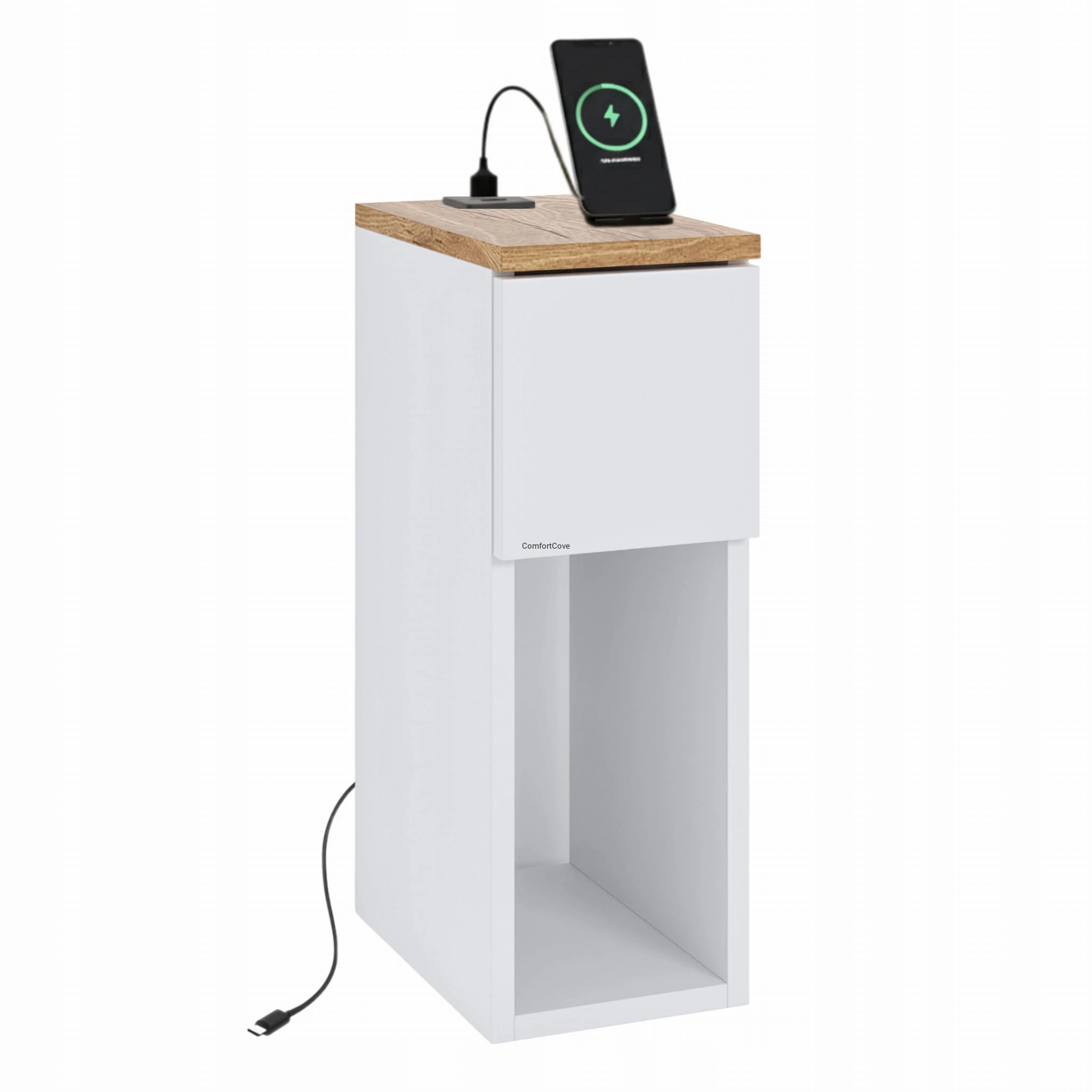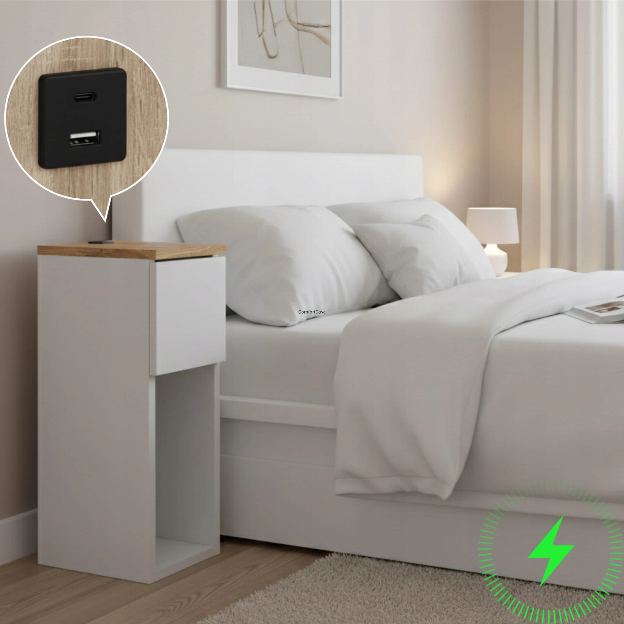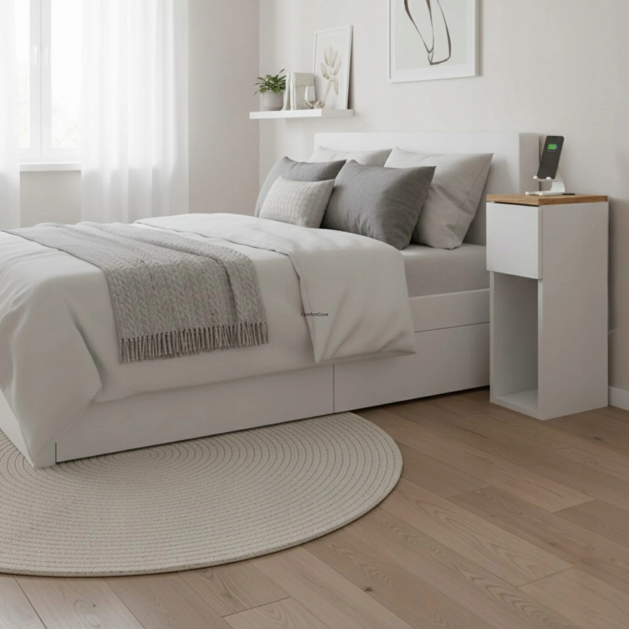Nowoczesna szafka nocna ComfortCove łączy w sobie minimalistyczny design i codzienną funkcjonalność, dzięki czemu sprawdzi się w każdej sypialni. Służy nie tylko jako elegancki stolik przyłóżkowy, ale też jako dyskretna stacja ładująca.
