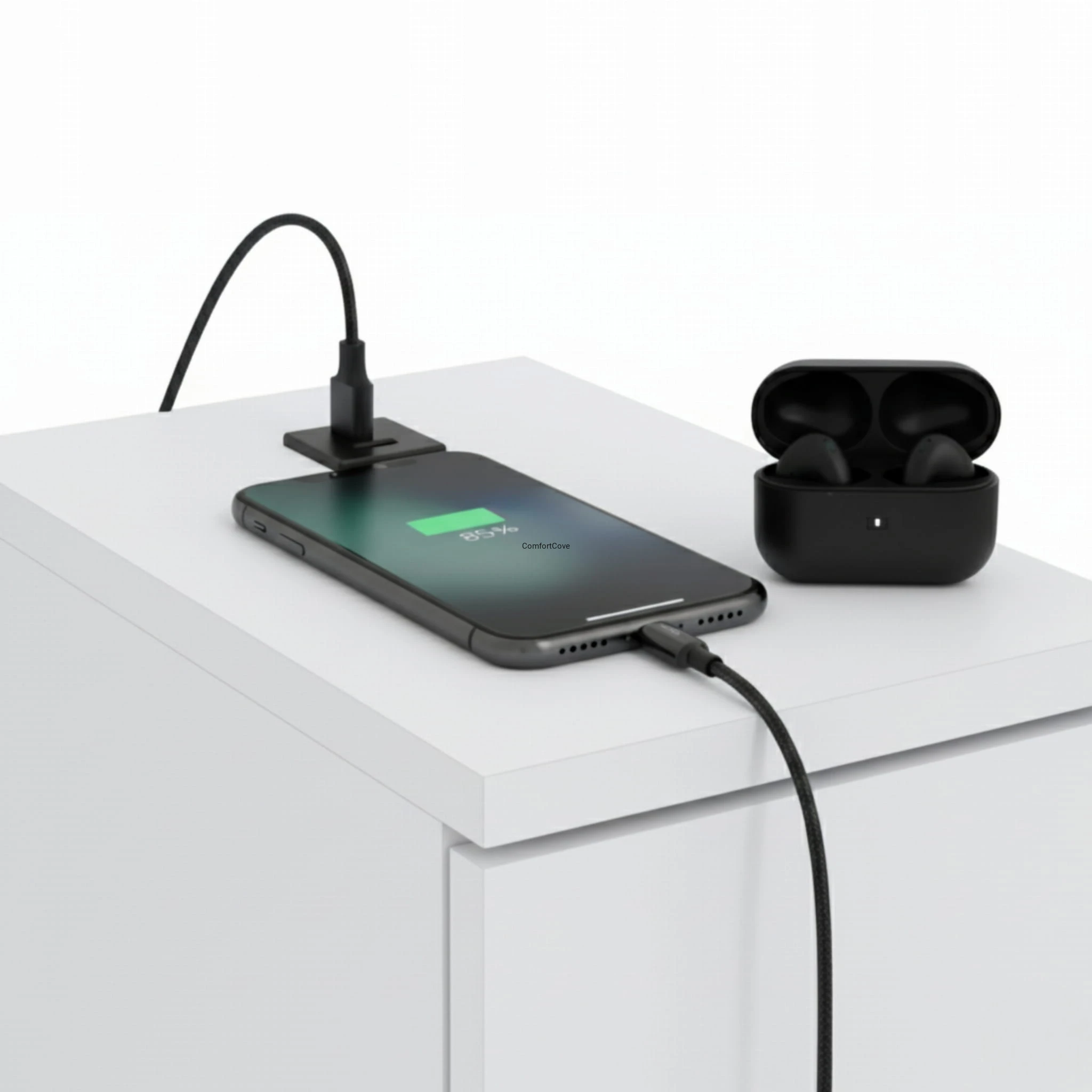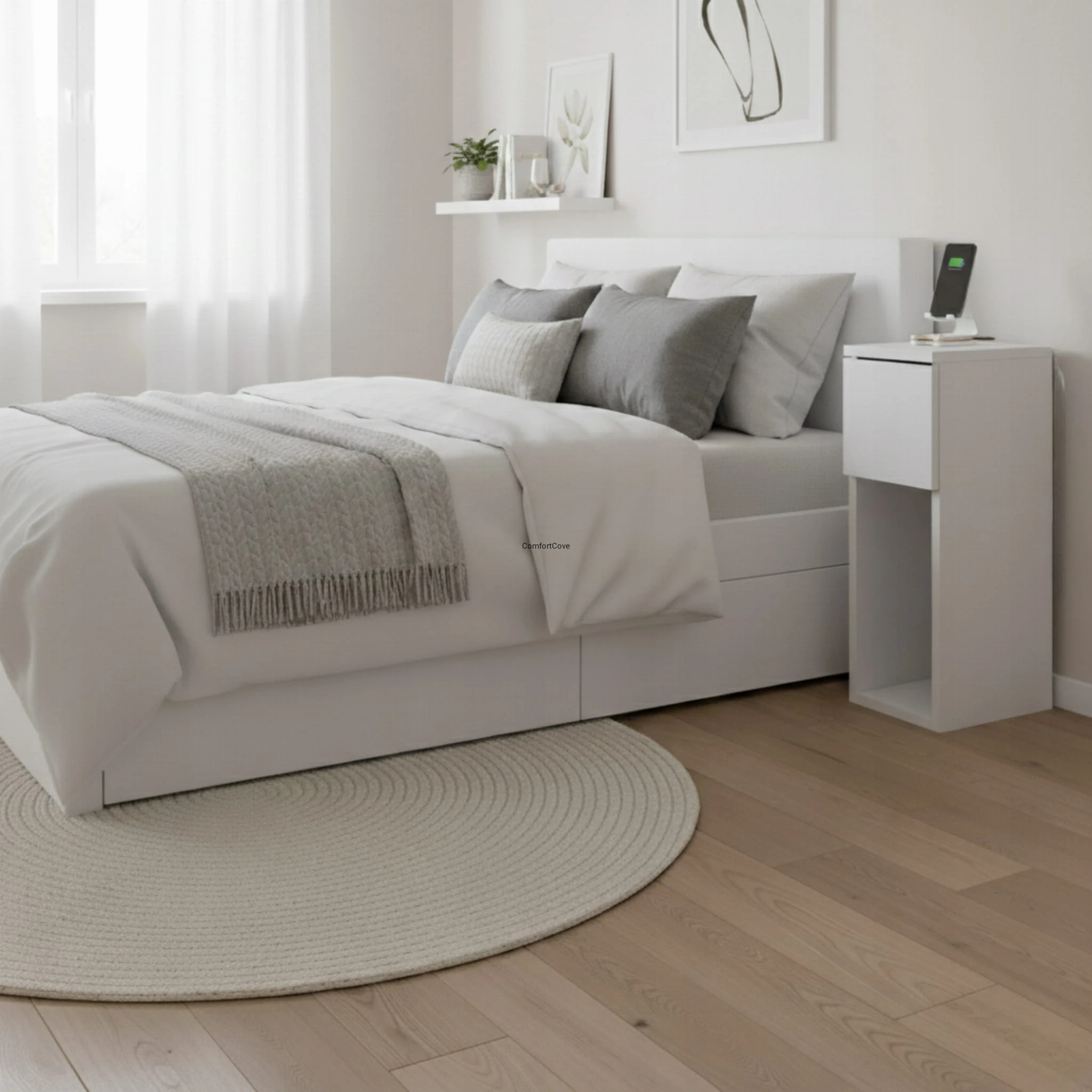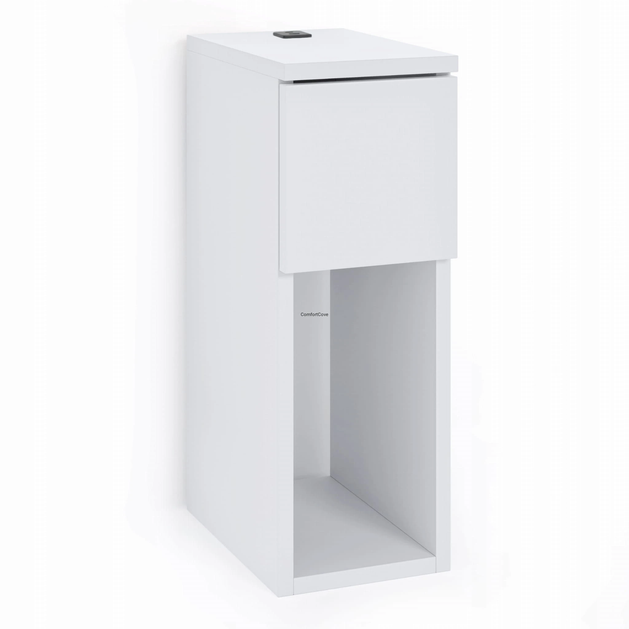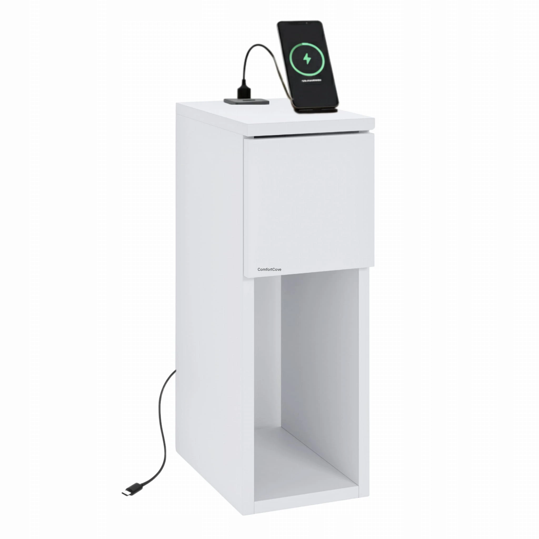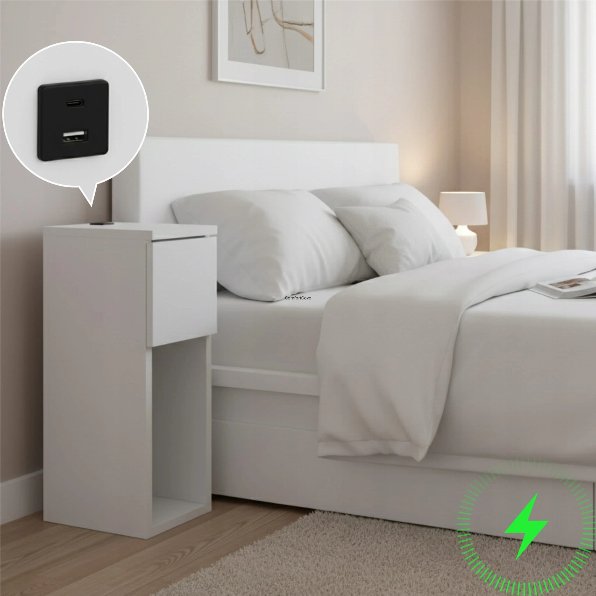 Nowoczesna szafka nocna ComfortCove łączy w sobie minimalistyczny design i codzienną funkcjonalność, dzięki czemu sprawdzi się w każdej sypialni. Służy nie tylko jako elegancki stolik przyłóżkowy, ale też jako dyskretna stacja ładująca.